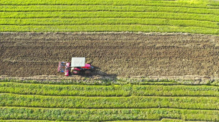 1月28日,湖南省常宁市三角塘镇江南村村民驾驶农机翻耕农田(无人机照片)