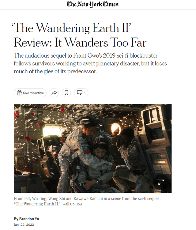 说到《流浪地球2》的海外评价,最近也有一篇《纽约时报》的影评引起很多人的注意,其中评这部电影“可笑愚蠢”,而这篇影评的作者,就是这位Brandon Yu。