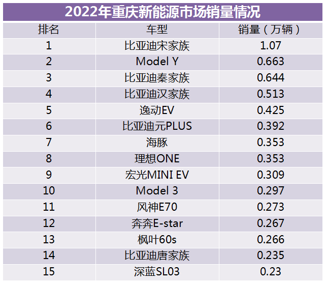 比亚迪绝对算得上大赢家。宋家族、元PLUS、唐家族、海豚、秦家族、汉家族都跻身重庆本地销量榜前列。特斯拉的Model Y与Model 3,也不逞多让。逸动EV、风神E70、枫叶60S则是运营车的“首选”,宏光MINIEV、奔奔E-star则被代步车需求的消费者加入了购物车。