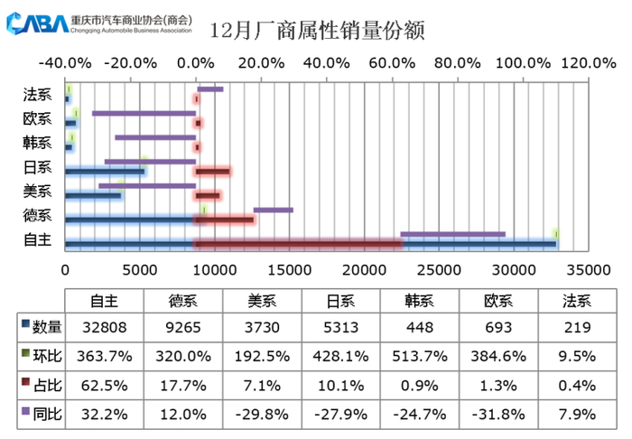 数据显示,中国品牌12月销量达32808辆,同比增长32.2%,占比达62.5%。