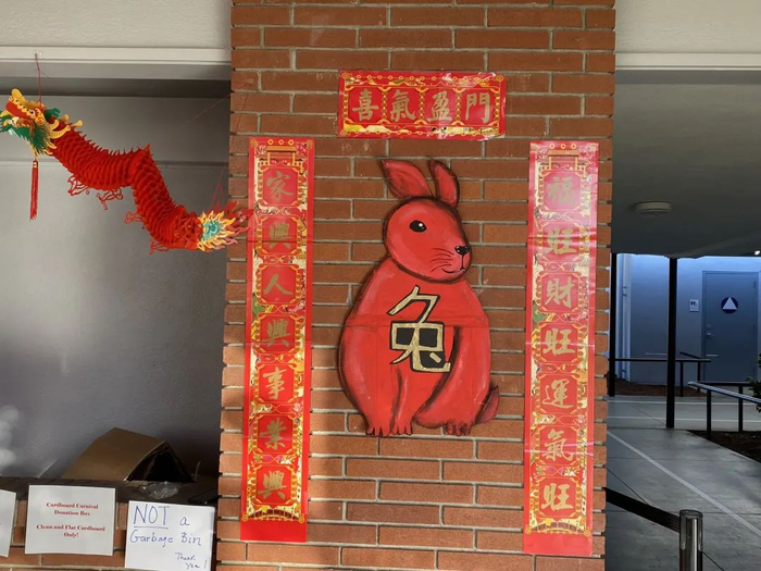 尽管是美国的学校,但学校里的大门口都贴着春联,上面用汉字写着大大的祝福语。