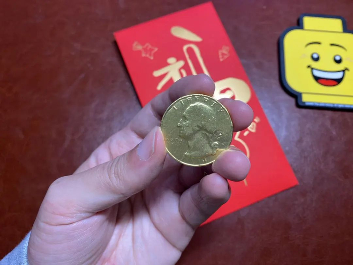 我打开一看,原来是我们小时候吃的那种巧克力金币,只不过这里印的却是美元的符号。