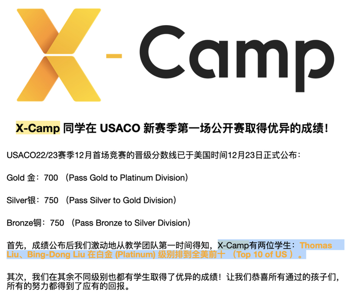 信里说,他们有两个学生在全美信息学奥赛中,打进了全国十强。