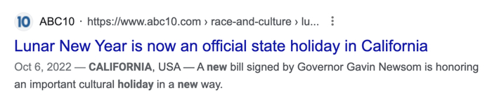 也就是说,在中国新年这一天,加州的政府、公立学校都会放假一天,来庆祝新年。