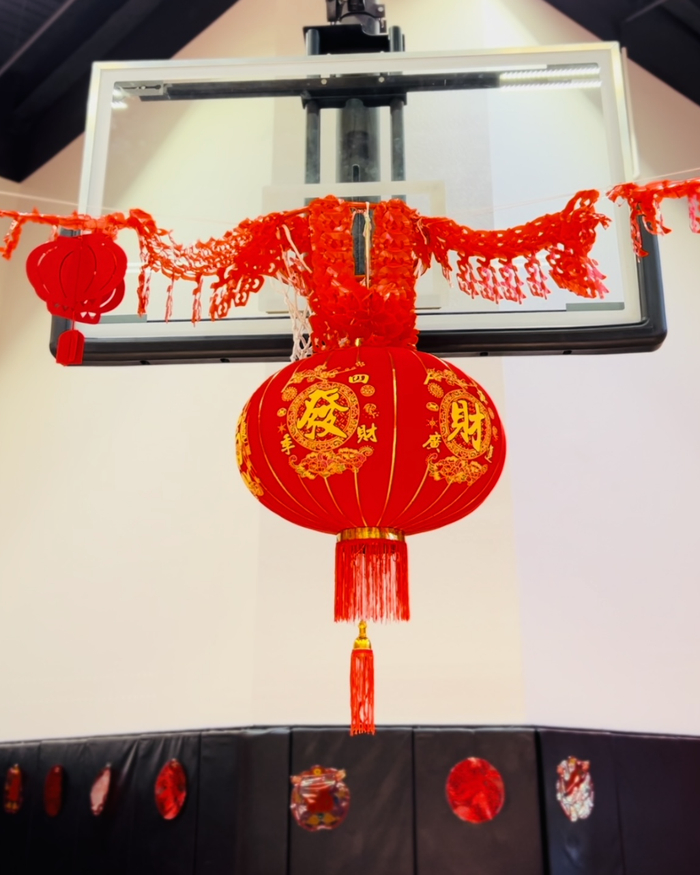 连篮球架上都挂着灯笼,上面写着“发财”,还有很多“福”字也从天而降。