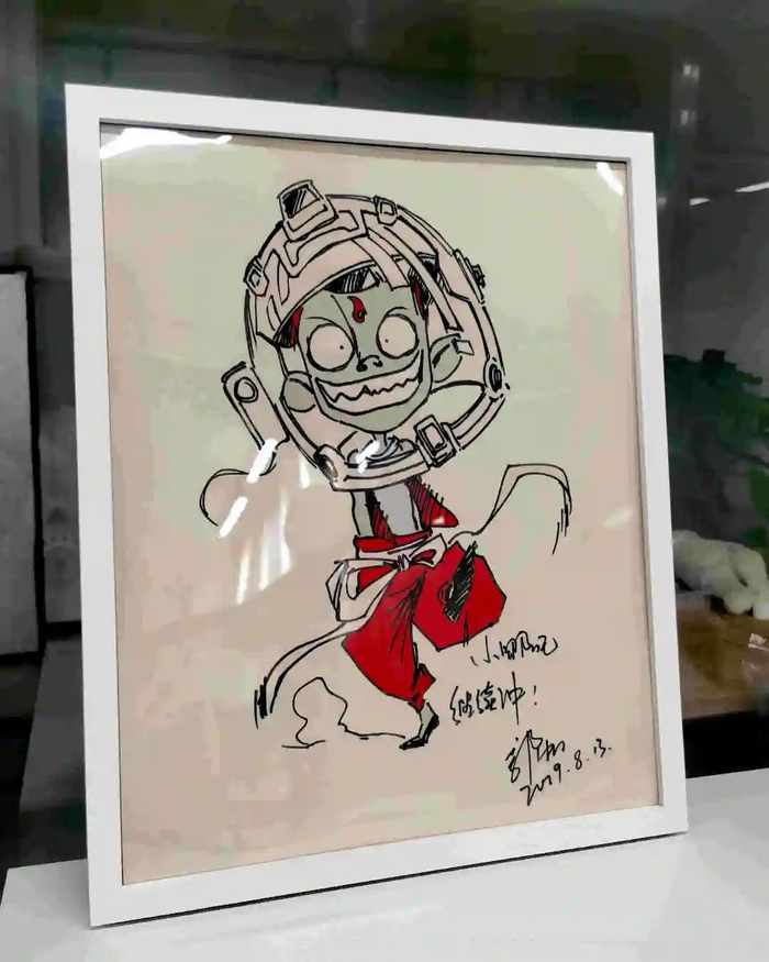 桌面上摆放着的郭帆手绘的漫画“小哪吒,继续冲!”,落款时间2019.8.13,是郭帆为祝贺《哪吒之魔童降世》票房超越《流浪地球》所画。