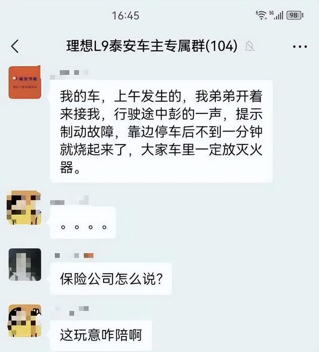 网传的一张聊天截图显示,一位自称为“车主本人”的用户在“理想L9泰安车主专属群”内表示:“上午发生的,我弟弟开着来接我,行驶途中彭(嘭)的一声,提示制动故障,靠边停车后不到一分钟就烧起来了,大家车里一定要放灭火器。”