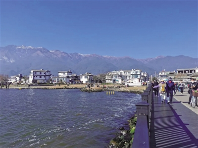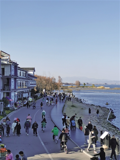 下午2点多,气温大约17℃,洱海边的风力大概有4-5级,天空碧蓝如洗,没有一丝云彩,一如往常的冬季。磻溪S湾游客众多,步行和骑单车的人流交织在一起。有三五个歌手架起了直播支架,在S湾的转弯阴影处弹吉他,唱民谣,大方地让路人拍照。沿途依然有几个本地阿姨叫卖,编脏辫或者卖气球。小吃摊上售卖烤肠冰淇淋手打柠檬茶等等。