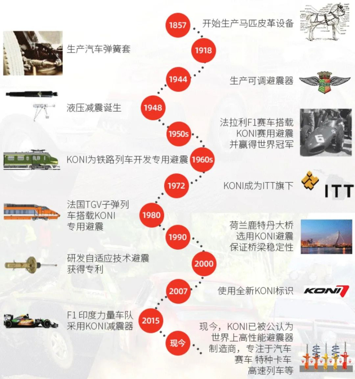 KONI避震器最早要追溯到1857年,最早的创始人是给马匹做相关配套的公司。后续1918年,开始给最早的车子做了相应配套。