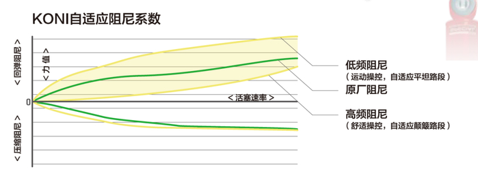 能够达到这种效果,是因为KONI Special Active变色龙系列,透过专利的”广域自适应阻尼技术”, 能够自适应驾驶路况(行驶速度和路面情况),避震阻尼自适应的力度动态变化从-15%~+50%,即时(毫秒间)调整避震内部阻尼力,这将造成车辆在各种不同的路况下行驶都可以非常平稳。