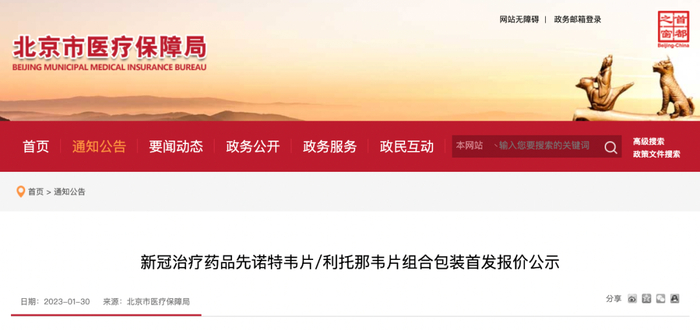 1月30日,北京医保局官网发布新冠治疗药品先诺特韦片/利托那韦片组合包装首发报价公示。