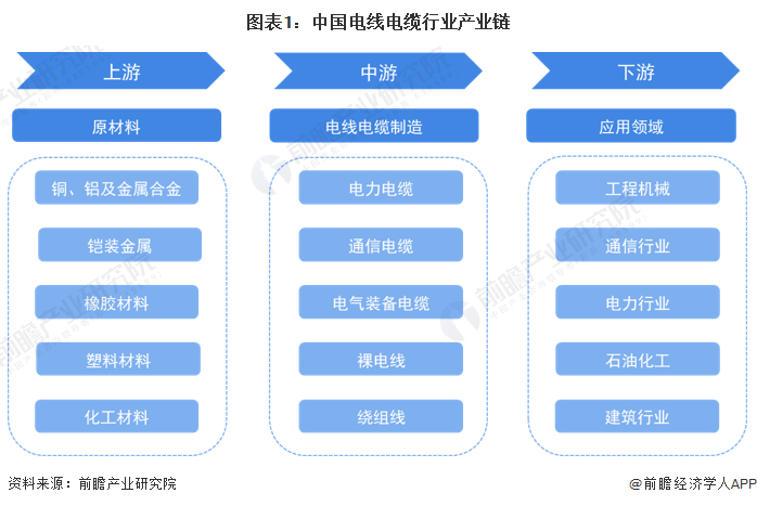目前,我国电线电缆行业产业链较为成熟,上游行业主要为提供制造电线电缆产品原材料的基础材料行业以及制造交联绝缘套及护套料的橡胶行业,如铜、铝及其合金、聚乙烯、聚氯乙烯化工行业等;中游包括提供电力电缆、通信电缆、电气装备用电缆及裸电线、绕组线等其他类型电缆的电线电缆生产制造企业;下游主要为对电线电缆有需求的行业,如工程机械、通信行业、电力行业、石油化工及建筑行业等。