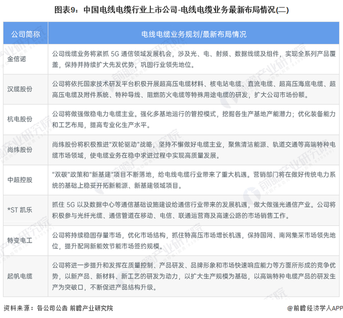 “十四五”时期,国家将大力提升风电、光伏发电规模;提高特高压输电通道利用率,对电线电缆的质量提出了新的要求。据此,电线电缆行业的上市企业-汉缆股份也相应提出了最新的发展规划,积极开展超高压电缆材料、核电站电缆、直流电缆、超高压海底电缆、超高压电缆及附件系统等特殊用途电缆的研发。此外,电线电缆行业的其他上市公司也明确了其电线电缆业务的发展布局: