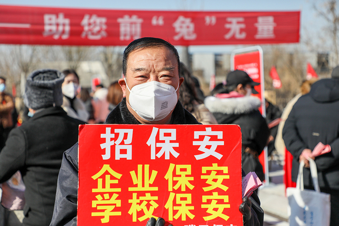 2023年1月29日,山东枣庄,在滕州市2023年春风行动暨就业援助月专场招聘会的现场,用人单位工作人员举着牌子招聘保安。