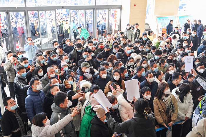 2023年1月30日,杭州,余杭区2023年“春风行动”就业首场招聘会在余杭人力资源市场线上线下同步启动,求职者络绎不绝。浙江日报记者 魏志阳 俞碧寅 摄