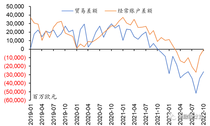 二是欧元区贸易条件有望改善。受制于能源价格的飙涨,严重依赖能源进口的欧元区2022年贸易逆差达到历史高位,短时间资本流出压力也给欧元汇率造成压力。不过伴随能源价格的回落,欧元区贸易逆差规模正逐步压缩。同时,欧元区当局正在就贸易合作问题做出努力。一方面,欧元区就美国《通胀削减法案》造成的贸易保护主义提出了异议并积极沟通,德国副总理哈贝克表示“欧洲需要采取类似措施作为回应”。另一方面,欧洲各国正积极与其他贸易伙伴展开对话,就受新冠疫情和俄乌冲突造成的供应链受阻问题展开沟通。因此,若能源价格能够企稳,预计2023年欧元区商品贸易逆差有望改善。