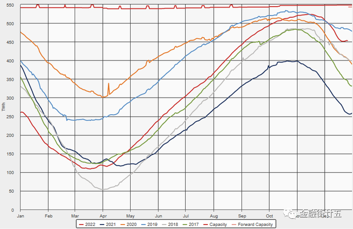 从主要欧洲天然气输送量和储能看,2022年天然气管道的输送量较往年明显增加。进入10月以后,欧洲整体天然气储备已超过2020年,年底稍有回落但仍仅次于2019年高点,一度逼近储能上限水平。面对相对疲软的国内需求,天然气储备的增加令欧洲大陆天然气供大于求,价格大幅回落。虽然寒冷的冬天仍是一个风险,但预计欧洲能顺利度过严冬,不会出现天然气耗尽的情况,而因此造成的通胀压力将有所缓解。
