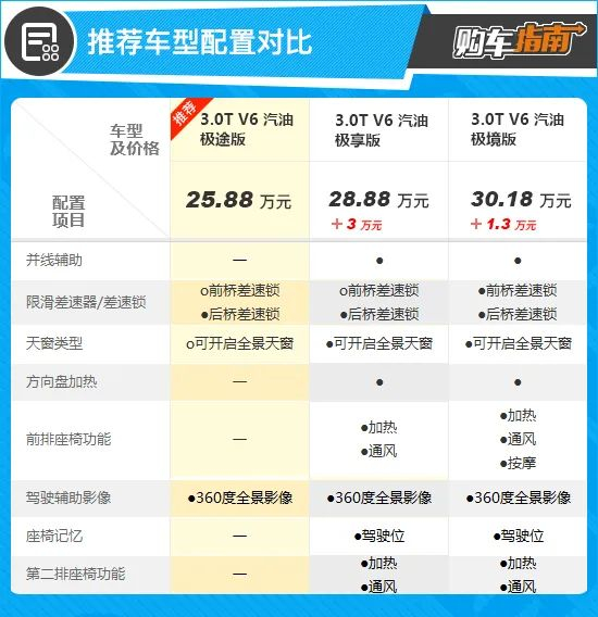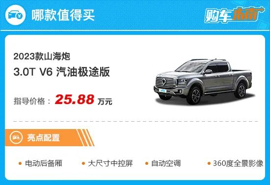 汽油版顶配车型与中配车型主要相差前桥差速锁功能,而消费者如果有需要,入门车型也是提供选装的。因此综合来看,如果您正在关注2023款山海炮,那么3.0T V6 汽油极途版值得您优先考虑。