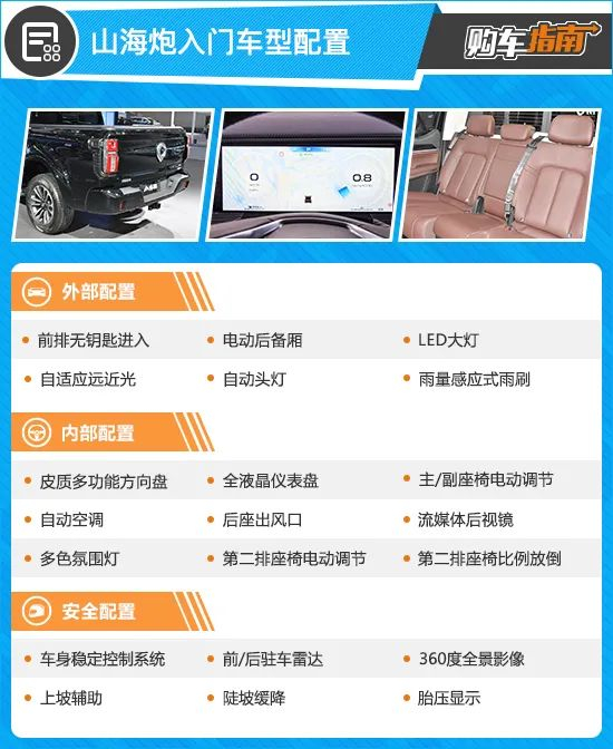 作为主打高端豪华的皮卡车型,山海炮在配置上的表现可谓令人瞠目结舌,整体非常出色。入门车型外部配备了前排无钥匙进入、电动后备厢、LED大灯、自适应远近光以及雨量感应式雨刷等常用功能,大幅提升了日常便利性。内部则配备了全液晶仪表盘、大尺寸中控屏、流媒体后视镜等科技配置,并且主/副座椅均为电动调节,再配合上自动空调、后座出风口以及多色氛围灯,整车配置表现达到了中高端乘用车的水平。安全配置方面,新车配备了常用到的前/后驻车雷达、360度全景影像以及上坡辅助等。
