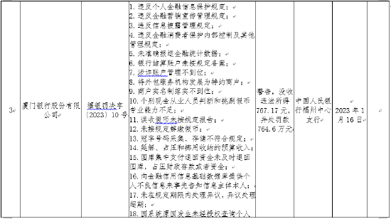 1月31日消息,厦门银行近日收央行大罚单!中国人民银行福州中心支行网站昨日公布的行政处罚信息公示表(福银罚决字〔2023〕10号)显示,厦门银行涉“二十三宗罪”。中国人民银行福州中心支行对其警告,没收违法所得767.17元,并处罚款764.6万元。
