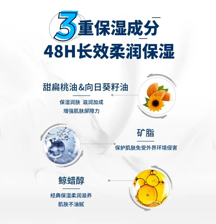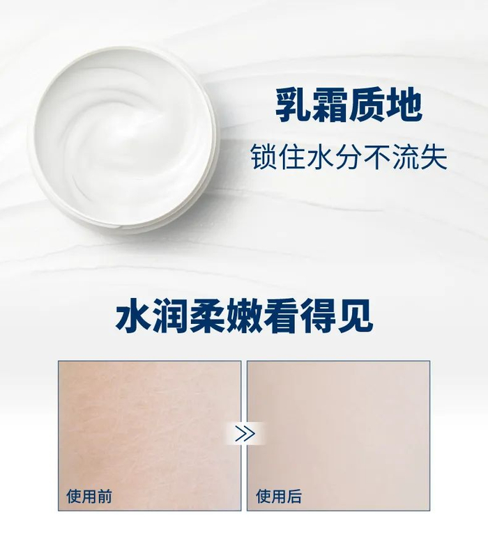 经典保湿成分鲸蜡醇,长效锁水的同时还能修护肌肤屏障,提升肌肤自身保湿功能;加上能有效隔绝空气和细菌的矿脂,在肌肤表面建立一层护膜,抵御外界环境侵害。
