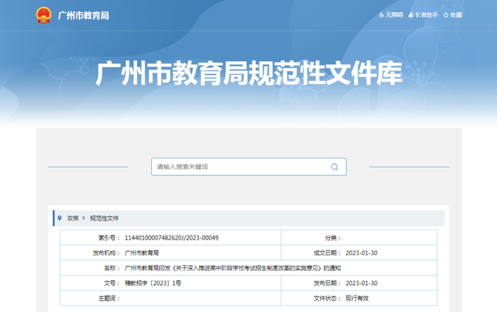 1月30日,广州市教育局印发《广州市教育局关于深入推进高中阶段学校考试招生制度改革的实施意见》(以下简称《实施意见》)。