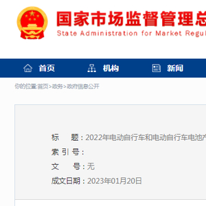 中国质量新闻网讯 据市场监管总局网站2023年1月31日消息,2022年,市场监管总局组织开展了电动自行车和电动自行车电池产品质量国家监督抽查。抽查情况通报如下: