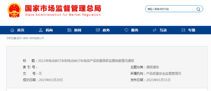 市场监管总局通报2022年电动自行车和电动自行车电池产品质量国家监督抽查情况