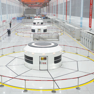 驱车下山,行至一座巨大的山门。大门缓缓打开,只见一条巨大的通道向下延伸,向内行驶一段,方才豁然开朗。地下厂房长400多米、宽25米、内高50多米,建于6条双向水道上方。在厂房中央,一排白色圆顶形机组一字排开,连接地下输水系统,这正是整座抽水蓄能电站的关键——12台30万千瓦可逆式水泵水轮机发电电动机组。