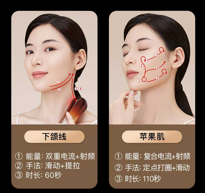 需要重点强调的是:在这个模式下,建议你按照「下颌线」-「苹果肌」-「眼周」-「额头」的路径去护理。每个部位都要充分使用,需要换位置的时候,美容仪会发出滴声来提示你,完全不需要你自己计时。