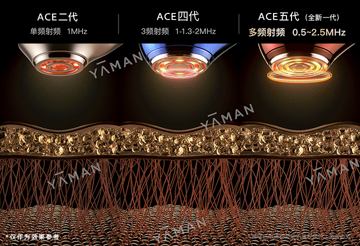 要知道不同频率的射频,对于真皮层的穿透力是不同的。这像这样: