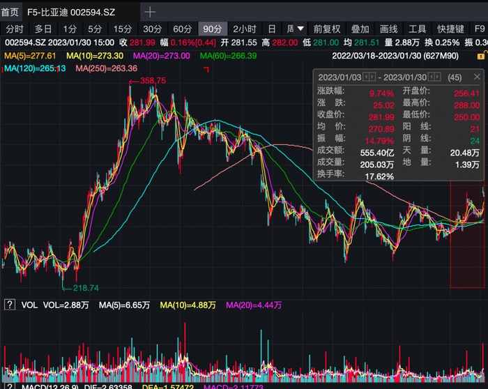 然而,从近一年的股价表现来看,比亚迪在A股市场中去年6月一度涨至358.75元/股的高位,成为万亿“迪王”,但此后比亚迪股价也是出现大幅调整,在去年10月一度跌至236元附近。