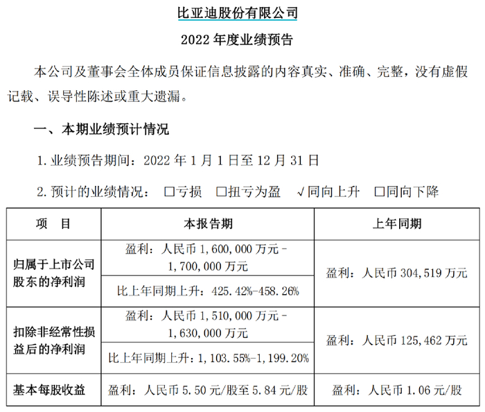 1月30日晚,比亚迪发布2022年业绩预告,公司预计期内实现营业收入超过4200亿元,实现归属于上市公司股东的净利润160亿元-170亿元,同比最高增长458.26%。扣非后归母净利润151亿元-163亿元,同比增长1103.55%-1199.20%。基本每股收益为5.5元/股-5.84元/股,2021年同期则为1.06元/股。