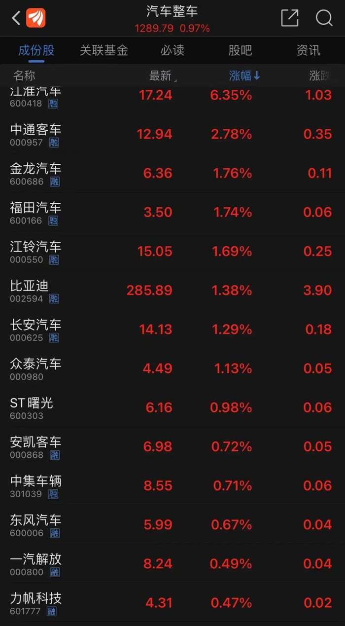 另外,1月31日午盘,A股汽车整车板块震荡拉升,江淮汽车涨6.35%,中通客车、福田汽车、金龙汽车、江铃汽车、比亚迪等跟涨。