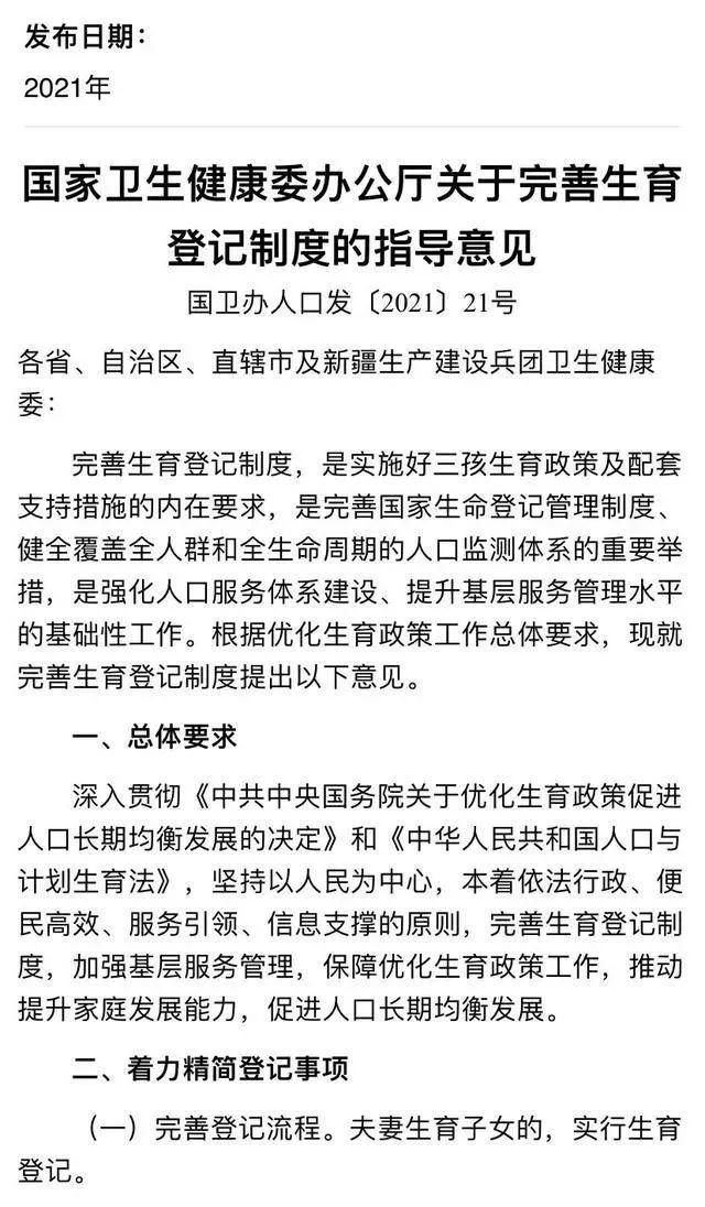 国家卫生健康委办公厅2021年发布关于完善生育登记制度的指导意见