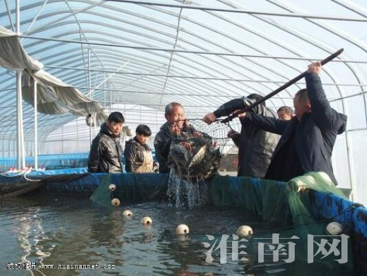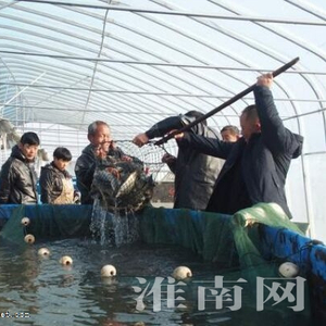 1月中旬,得知驭风水产合作社第二天要进行“圈桶”起鱼作业,鱼产品将销往蚌埠。次日一早,淮河早报、淮南网记者即赶往养殖基地。基地位于高塘湖西侧,在大通区上窑镇马庙村东南处。其中,传统养殖区有300多亩大水面和200多亩的池塘,传统养殖区南岸即是“圈桶养鱼”区,有一处大棚,棚内有4只大“圈桶”,社员们正在起鱼。只见社员们将“圈桶”内提前围好集中的鱼捞出,再进行分拣。这次是鲤鱼,大些规格的鱼将运走上市,小些达不到规格就放入露天池塘里继续养殖。棚外,正停着一辆运输活鱼的货车,上面要带着气瓶供氧。开车的经销商说,年节市场正需求碗头鱼,斤把重的鲤鱼正合适,市场价在每斤4、5块钱。