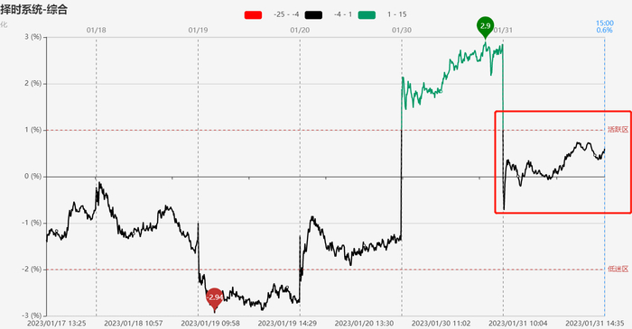 指标显示,市场短线情绪竞价回落到0轴附近,早盘处于窄幅震荡状态,午后有所回升。近两天开盘波动较大,主要受大盘的影响。