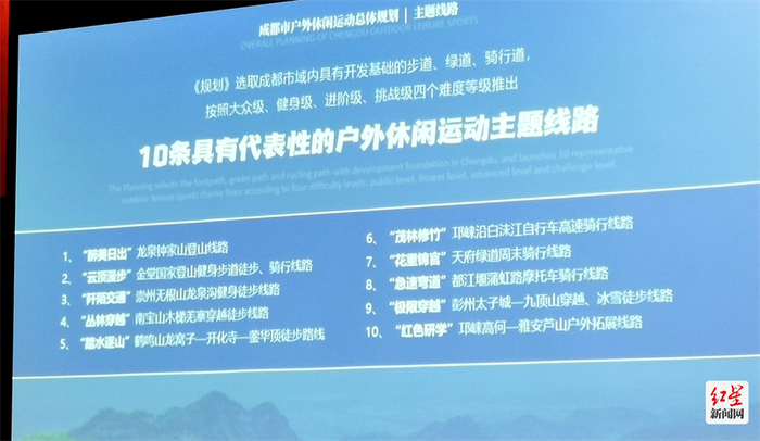 《规划》选取成都市域内具有开发基础的步道、绿道、骑行道,按照大众级、健身级、进阶级、挑战级四个难度等级推出10条具有代表性的户外休闲运动主题线路和一系列户外休闲运动赛事活动。