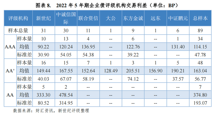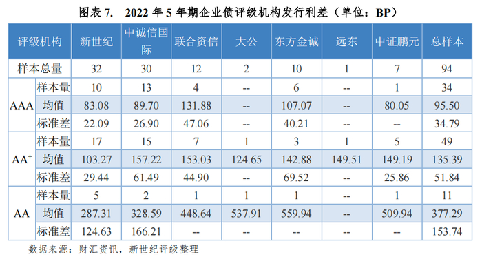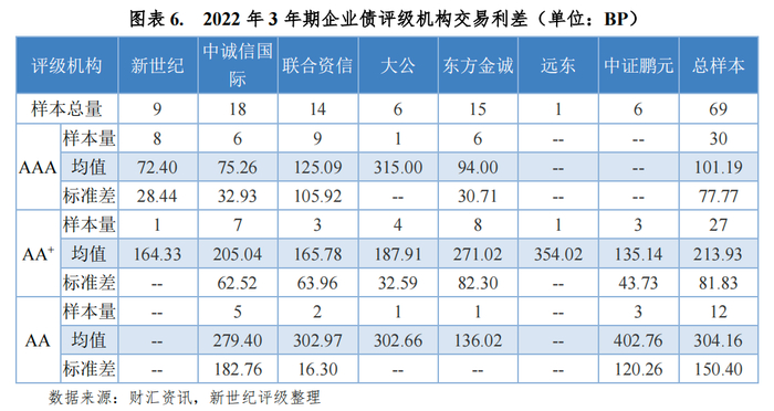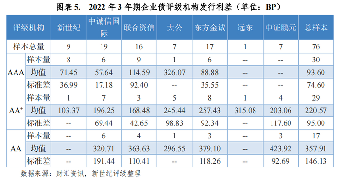本文分别以3年期、5年期企业债作为研究对象,对各评级机构各等级的发行利差均值进行统计和比较。