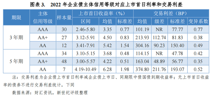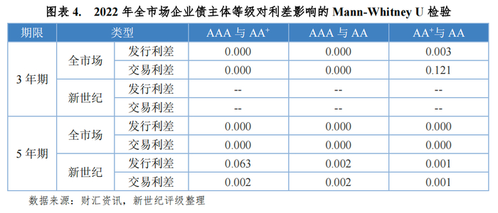 本文对全市场发行3年期、5年期企业债主体间的发行利差、交易利差进行Mann-Whitney U两独立样本非参数检验。新世纪评级3年期企业债主体样本量较少,暂未进行级别间显著性检验。