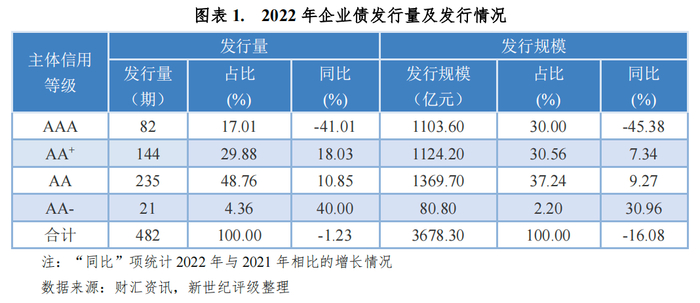2022年债券市场共发行企业债[1]482期,与上年同期基本持平,发债规模同比下降显著。发债主体信用等级包含AAA级、AA+级、AA级和AA-级四个信用等级,AAA级企业债的发行量和发行规模同比均大幅下降,而AA+级、AA级和AA-级企业债发行量和发行规模同比均显著上涨。2022年,AA级企业债发行量235期、发行规模1369.70亿元,在各等级中占比均为最高(图表1)。