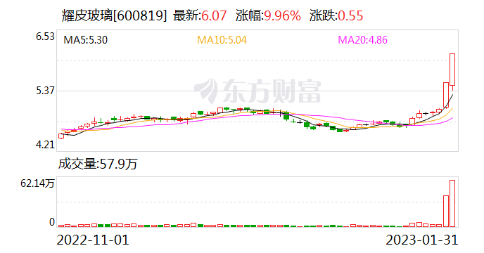 沪深交易所2023年01月31日公布的交易公开信息显示,耀皮玻璃因成为连续三个交易日内收盘价格涨幅偏离值累计20%上榜。耀皮玻璃当日收报6.07元,涨跌幅9.96%,换手率7.75%,成交额3.35亿元。异常期间01月30日至01月31日,期间涨幅20.92%,累计偏离值20.21%,区间成交额5.45亿元。