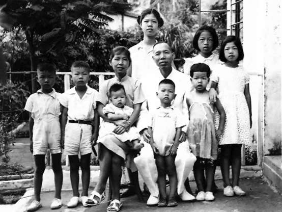 全家福,父亲丘镇英膝前立者为丘成桐。1955年摄于香港沙田龙凤台