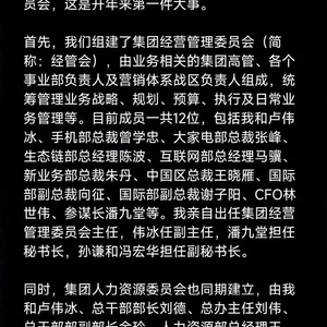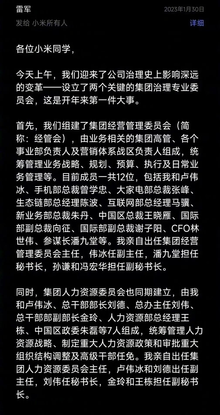 据凤凰网科技报道,雷军1月30日发布内部信宣布小米组织架构调整,设立两个关键委员会。具体设立两个集团治理专业委员会,包括集团经营管理委员会和集团人力资源委员会,并称这是公司治理史上影响深远的变革,也是开年来第一件大事。