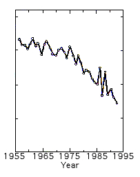 南极哈雷湾(Halley Bay)上方臭氧层厚度变化示意图,可见从70年代末起,臭氧层厚度出现大幅下降。图片来源:nobelprize.org