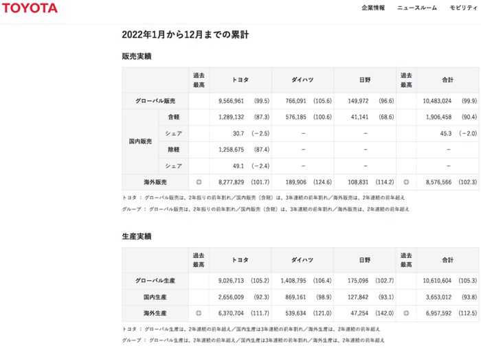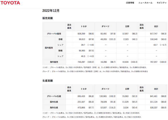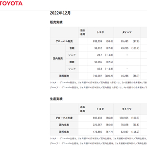 1月30日,丰田汽车集团对外发布12月及2022年全年产销数据。数据显示,2022年12月丰田汽车全球销量为83.93万辆,同比下降1.40%。其中日本本土销量同比下滑12.21%至9.90万辆;海外销量同比增长0.25%至74.03万辆。产量方面,2022年12月丰田汽车全球产量为69.54万辆,同比下降13.20%,其中日本本土市场产量同比下降15.03%至22.16万辆;海外市场产量同比下降12.31%至47.39万辆。