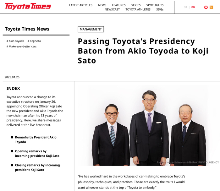 为尽快推动电气化转型,丰田汽车已于1月26日宣布,从今年4月1日起,丰田汽车现任董事长内山田竹志将卸任董事长一职,由丰田章男接任;丰田章男将卸任丰田汽车首席执行官(CEO)一职,由丰田首席品牌官兼雷克萨斯品牌负责人佐藤恒治接替。这是丰田汽车时隔14年迎来最高负责人的人事变更,虽然丰田章男将卸任CEO一职,但行业认为,后续丰田章男很可能继续以董事长的身份深度介入公司运营。