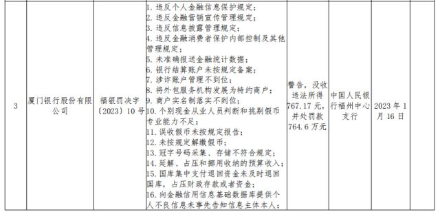 1月30日,中国人民银行福州中心支行披露的行政处罚决定书显示,厦门银行因违反个人金融信息保护规定等23项违法行为,中国人民银行福州中心支行决定对其警告,没收违法所得767.17元,并处罚款764.6万元。