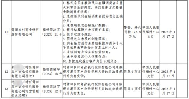 1月30日,莆田农村商业银行因10项违法违规行为,被中国人民银行福州中心支行予以警告,并处罚款173.8万元。
