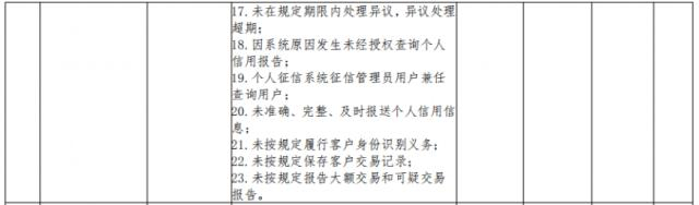 违反个人金融信息保护规定;违反金融营销宣传管理规定;违反信息披露管理规定;违反金融消费者保护内部控制及其他管理规定;未准确报送金融统计数据;银行结算账户未按规定备案;涉诈账户管理不到位;将外包服务机构发展为特约商户;商户实名制落实不到位;个别现金从业人员判断和挑剔假币专业能力不足;误收假币未按规定报告;未按规定解缴假币;冠字号码采集、存储不符合规定;延解、占压和挪用收纳的预算收入;国库集中支付退回资金未及时退回国库,占压财政存款或者资金;向金融信用信息基础数据库提供个人不良信息未事先告知信息主体本人;未在规定期限内处理异议,异议处理超期;因系统原因发生未经授权查询个人信用报告;个人征信系统征信管理员用户兼任查询用户;未准确、完整、及时报送个人信用信息;未按规定履行客户身份识别义务;未按规定保存客户交易记录;未按规定报告大额交易和可疑交易报告。